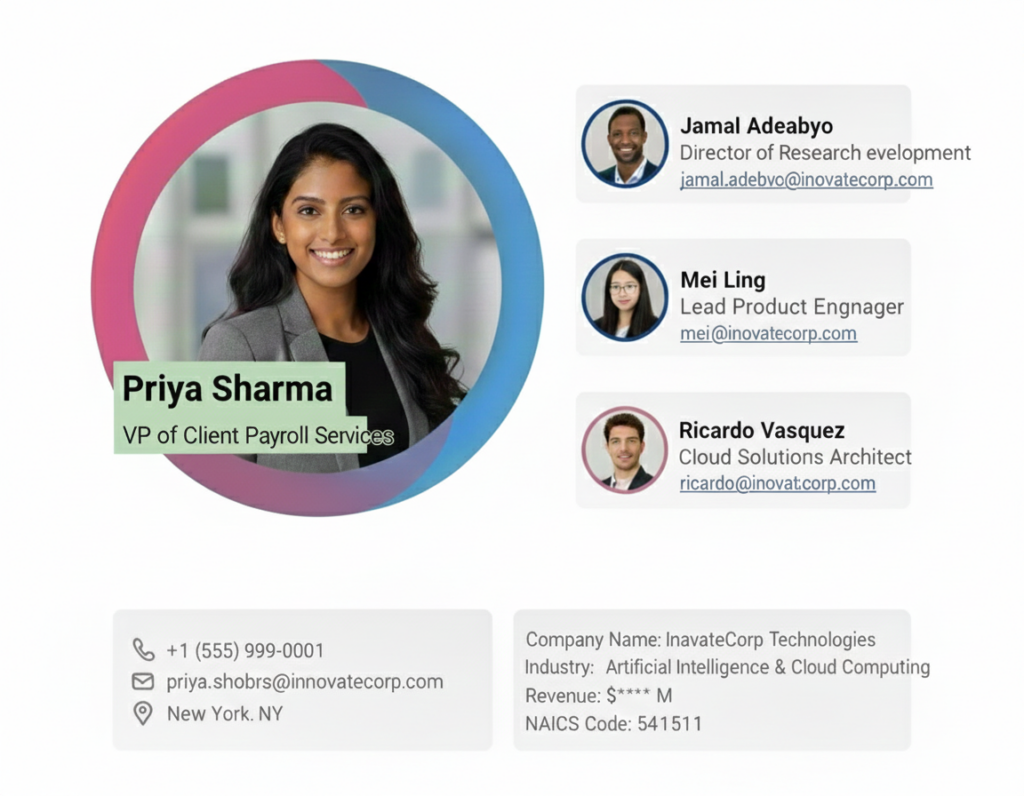 Engage decision-makers in real time with direct phone numbers sourced from our verified database. Cold calling becomes more effective when you’re contacting payroll leaders who actually influence purchasing decisions.